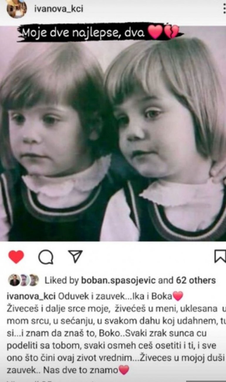 - Одувек и заувек, Ика Бока. Живећеш и даље срце моје у мени, уклесана у мом срцу, у сећању, у сваком даху који удахнем, ту си. И знам да то знаш, Боко. Сваки зрак сунца ћу поделити са тобом, сваки осмех ћеш осетити и ти, и све оно што чини овај живот вредним. Живећеш у мојој души заувек... Нас две то знамо - написала је Ивана.