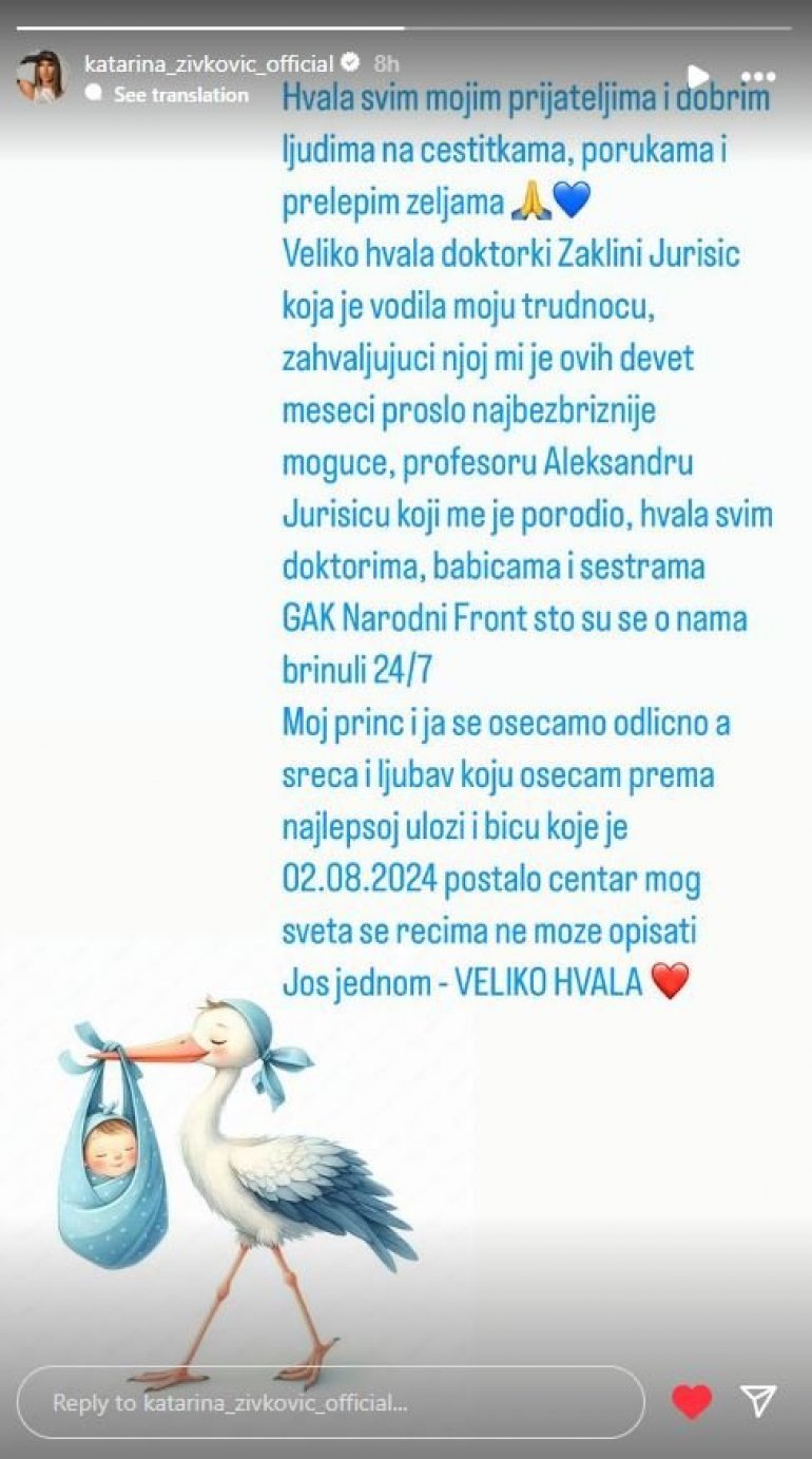 - Хвала свим мојим пријатељима и добрим људима на честиткама, порукама и прелепим жељама. Велико хвала и докторки која је водила моју труноћи, захваљујући њој је ових девет месеци прошло најбезбрижније могуће. Мој принц и ја се осећамо одлично, а срећа и љубав коју осећам према најлепшој улози и бићу које је 02.08.2024. постало центар мог света се не може речима описати. Још једном велико хвала - написала је Катарина.