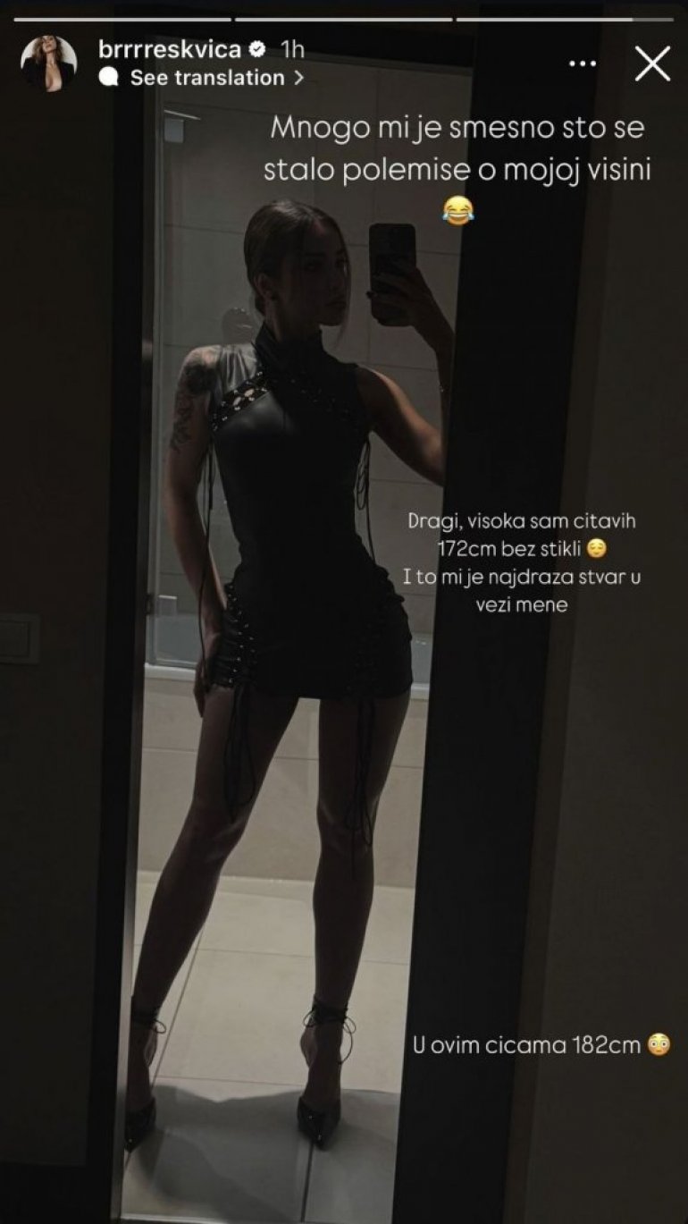 - Много ми је смешно што се стално полемише о мојој висини. Драги, висока сам читавих 172 цм без штикли и то ми је најдража ствар у вези мене - навела је Бресквица, а како на фотографији носи штикле, открила је колико су јој оне дале на висини.