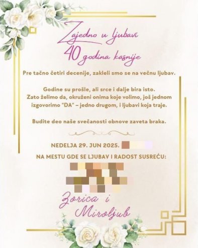 - Пре тачно четири деценије заклели смо се на вечну љубав. Године су прошле, али срце и даље бира исто. Зато желимо да, окружени онима које волимо, још једном изговоримо „ДА“ - једно другом и љубави која траје. Будите део наше свечаности обнове завета брака. На месту где се љубав и радост срећу.