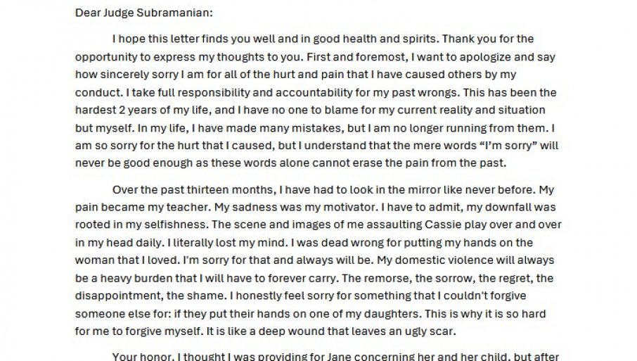 У емотивном обраћању, Комбс је рекао да су последње две године његовог живота биле најтеже и да нема кога другог да окриви осим себе. Посебно је истакао сцене насиља над бившом партнерком Касандром „Кеси“ Вентуром као нешто што га прогања сваки дан.