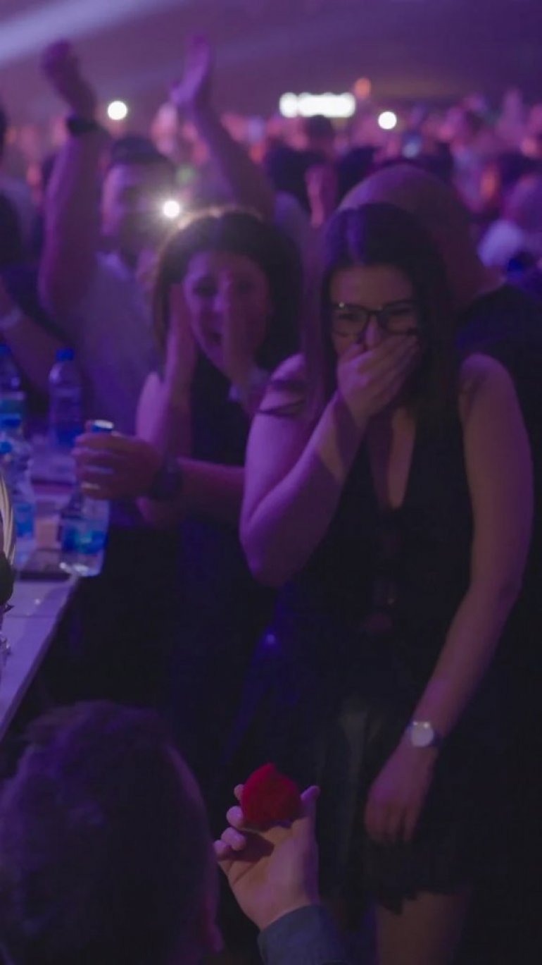 Док се на великом екрану и око њих одвијала се чаролија, он је клекнуо пред своју девојку, која је бризнула у сузе од изненађења и среће, а емотиван чин је поздрављен је аплаузом свих присутних.