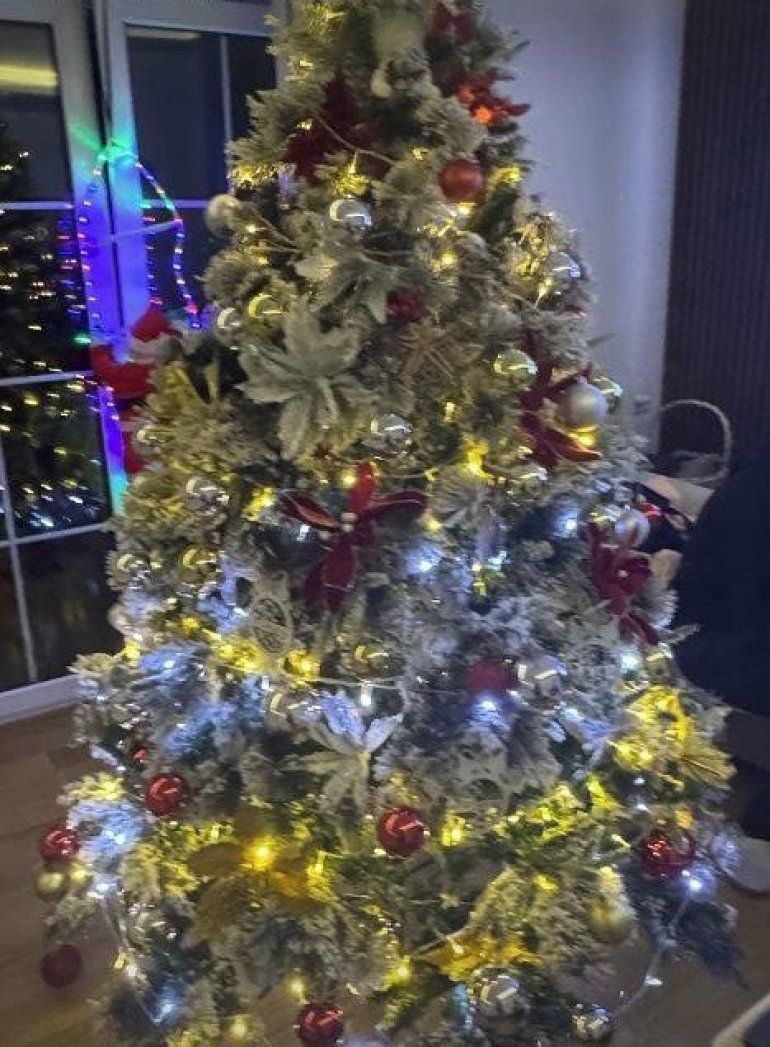 Тањина јелка до плафона одузима дах, а на њој се налази мноштво лампица, цветова, лоптица, Деда Мразића и украса који су учинили новогодишње дрво чаробни.