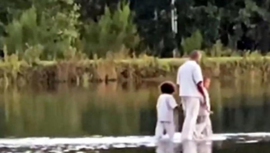 Реперу су се придружила његова седмогодишња ћерка Норт и четворогодишњи син Сејнт у ходу по води, а они су заправо ходали по провидној платформи скривеној одмах испод површине воде.