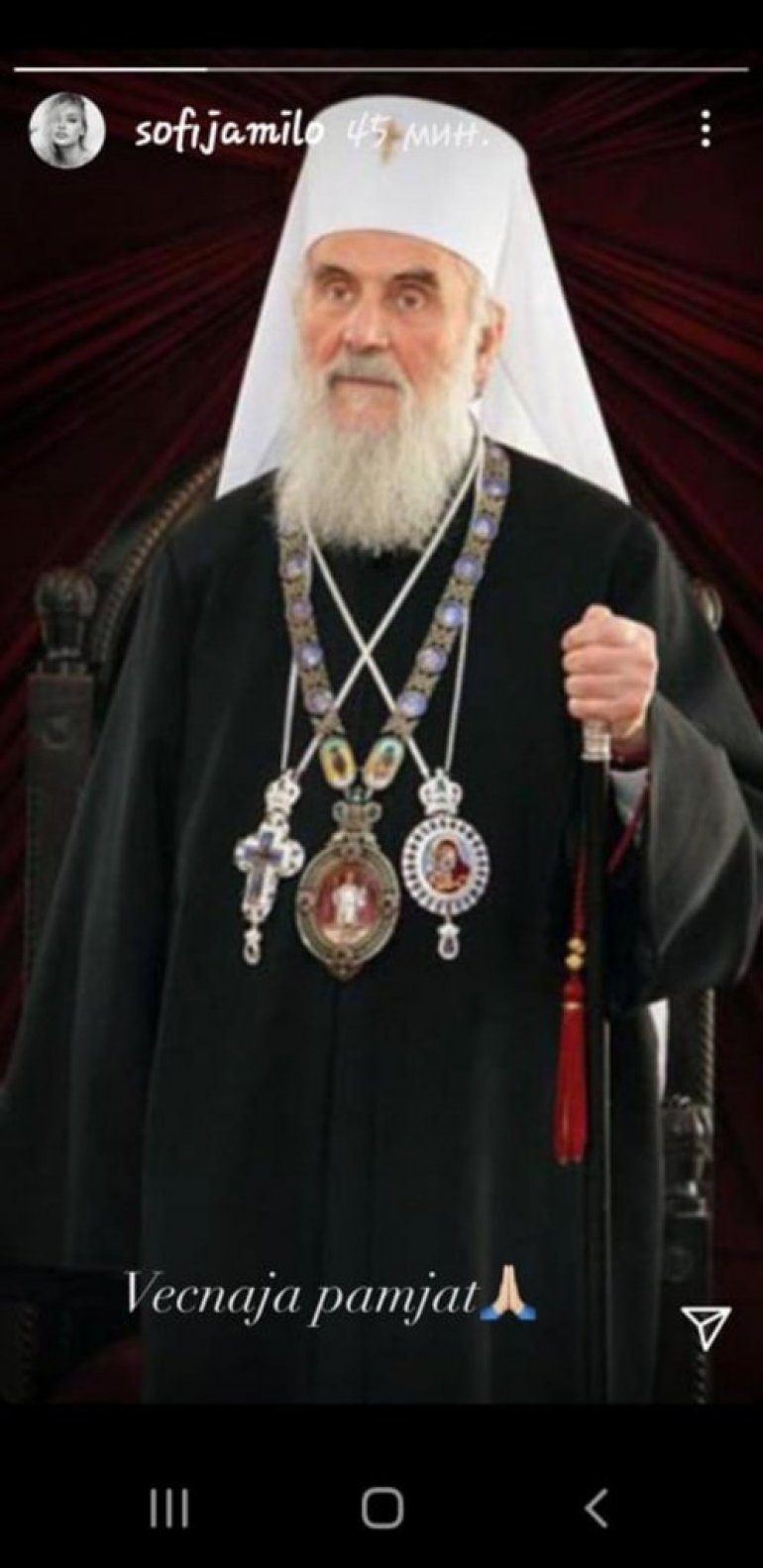 Вики Миљковић је на Инстаграм сторију поставила фотографију упокојеног патријарха: Вечни помет и царско небестко.