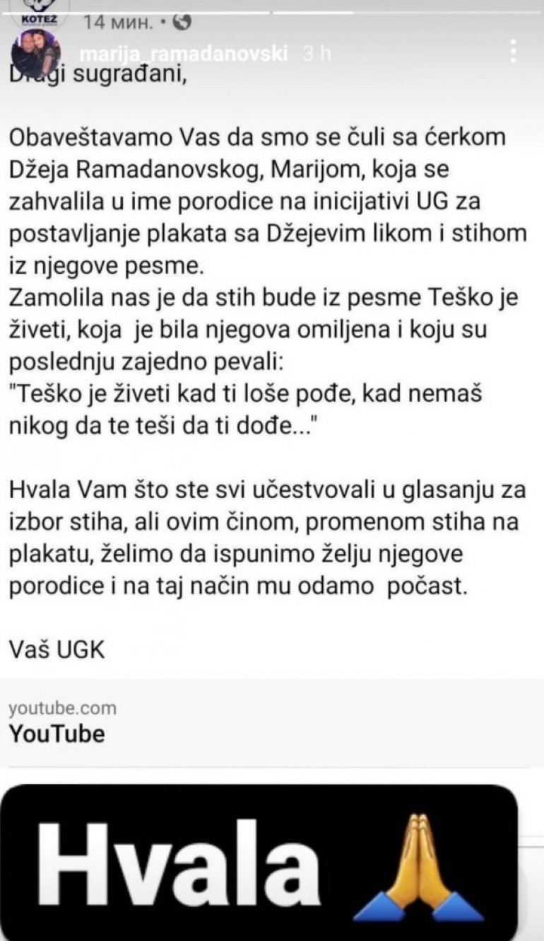 - Драги суграђани, обавештавамо Вас да смо се чули са ћерком Џеја Рамадановског, Маријом, која се захвалила у име породице на иницијативи УГ за постављање плаката са Џејевим ликом и стихом из његове песме. Замолила нас је да стих буде из песме Тешко је живети, која је била његова омиљена и коју су последњу заједно певали: "Тешко је живети кад ти лоше пође, кад немаш никог да те теши да ти дође..." - наводе из УГК.