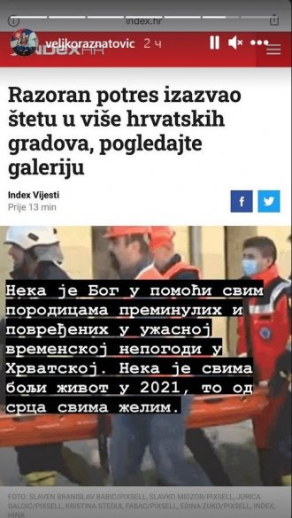 - Нека је Бог у помоћу свим породицама преминулих и повређених у ужасној временској непогоди у Хрватској. Нека је свима бољи живот у 2021. то од срца желим - написао је Вељко на инстаграму.