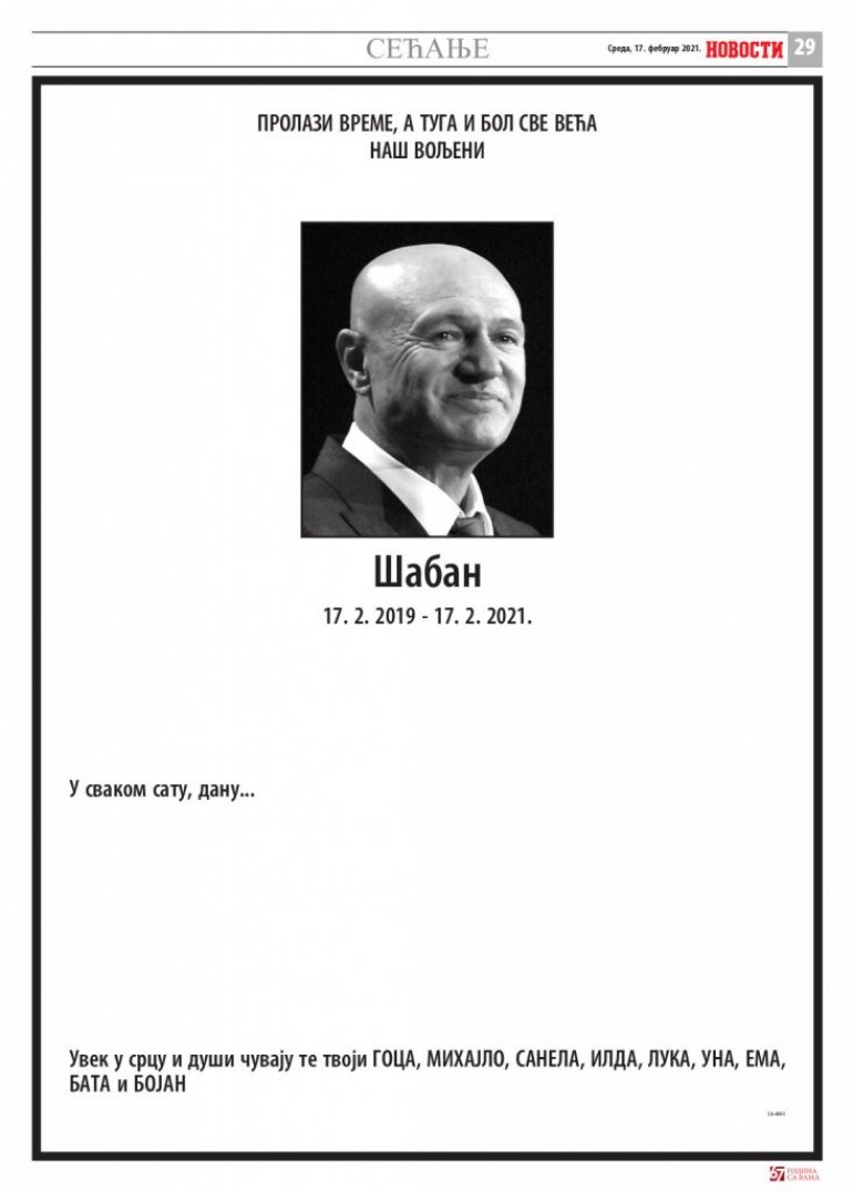 "Пролази време, а туга и бол све већа. Наш вољени Шабан. У сваком сату, дану... Увек у срцу и души чувају те твоји Гоца, Михајло, Санела, Илда, Лука, Уна, Ема, Бата и Бојан", пише у читуљи.