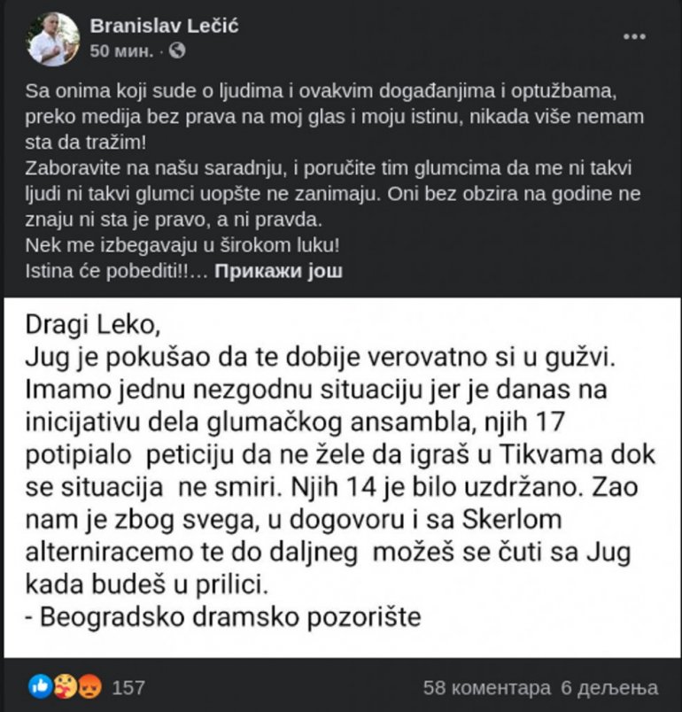 - Са онима који суде о људима и оваквим догађањима и оптужбама, преко медија без права на мој глас и моју истину, никада више немам шта да тражим! Заборавите на нашу сарадњу, и поручите тим глумцима да ме ни такви људи ни такви глумци уопште не занимају. Они без обзира на године не знају ни шта је право, а ни правда. Нек ме избегавају у широком луку! Истина ће победити!! Драги Лека одговара на поруку Београдског драмског позоришта - написао је глумац.