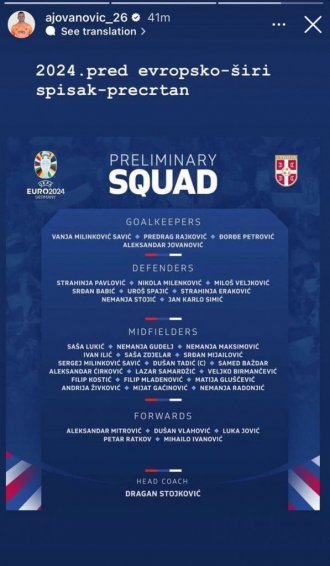 Јовановић није био међу 26 путника за ЕУРО у Немачкој. Пикси је предност дао Вањи Милинковић-Савићу, из Торина, Предрагу Рајковићу из Мајорке и Ђорђу Петровићу из Челсија.