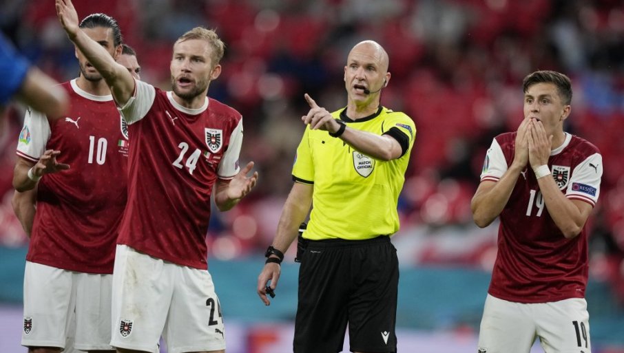 74. МИНУТ - Песина је оборио Лајнера, негодују Аустријанци - траже пенал, а Тејлор показује на гол аут.