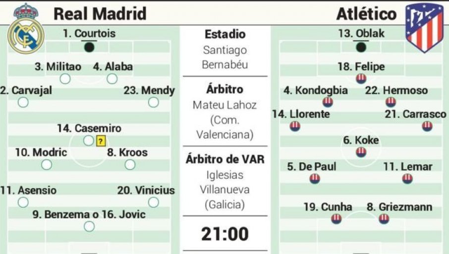 Бензема је у суботу тренирао, према речима тренера Карла Анћелотија "осећа се фино, спреман је и играће у дербију", али "Ас" наводи да би италијански стручњак могао Француза да уведе у игру у другом делу меча, уместо Јовића, или да најбољем стрелцу екипе помогне тако што ће му придружити Србина у стартној постави.