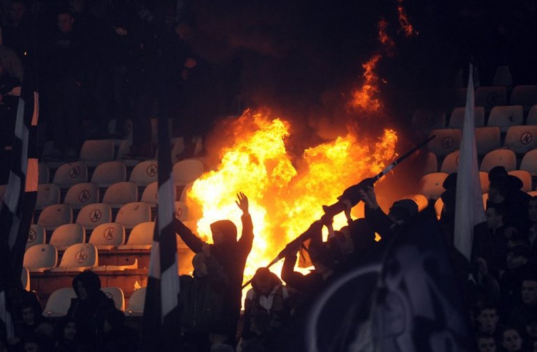 35' - Неколико столица је запаљено на јужној трибини, на којој се окупљају навијачи Партизана: