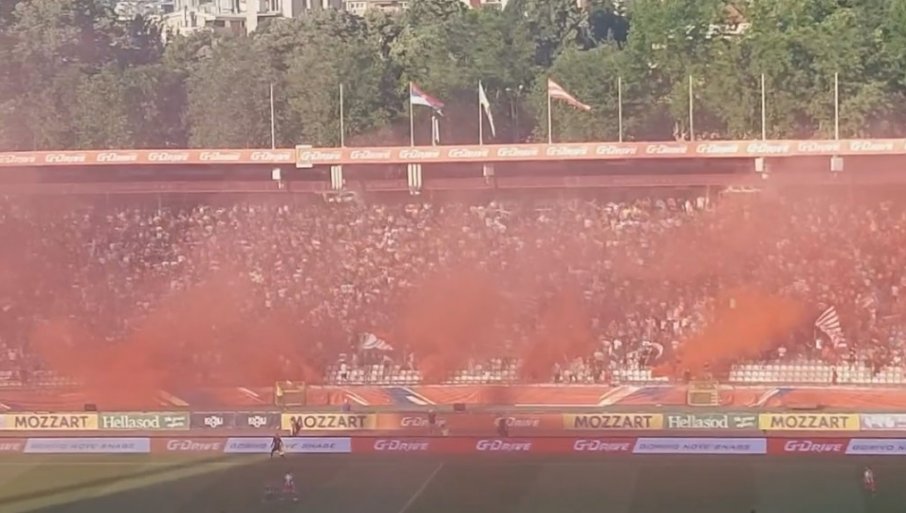 Истовремено, на "северу", али и на источној и западној страни највећег стадиона у нашој земљи, све је прекрио црвени дим, што можете и видети у снимку који је пред вама: