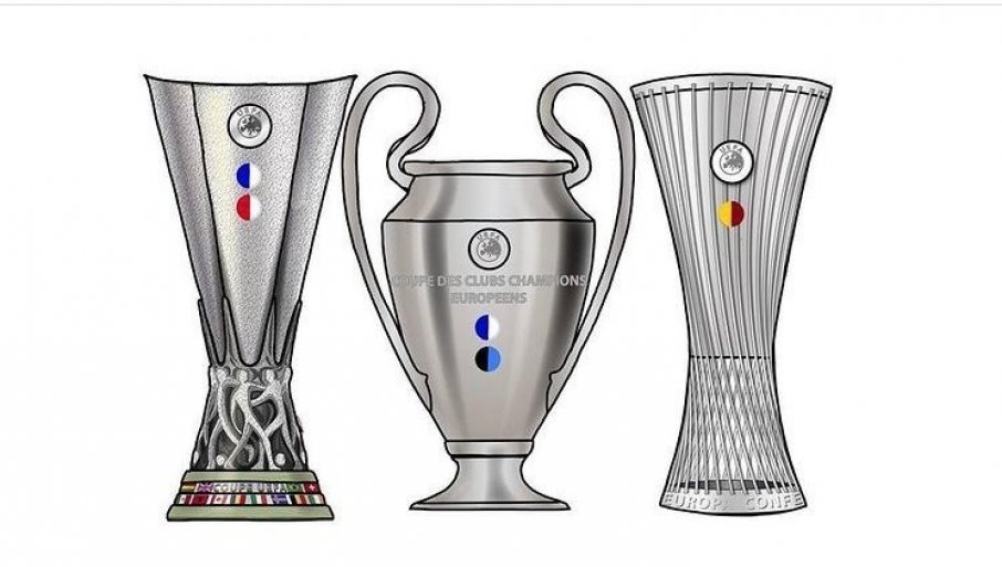 Лево се налази нацртани пехар Лиге Европе, коју је освојио и с Портом и с Манчестер јунајтедом, а десно је награда коју подиже победник Лиге конференција, такмичења ког је Мурињо освојио с Ромом.