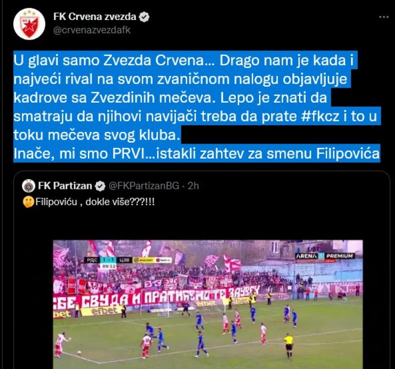 - У глави само Звезда Црвена… Драго нам је када и највећи ривал на свом званичном налогу објављује кадрове са Звездиних мечева. Лепо је знати да сматрају да њихови навијачи треба да прате Црвену звезду и то у току мечева свог клуба. Иначе, ми смо први истакли захтев за смену Филиповића, написано је на Твитеру Црвене звезде.