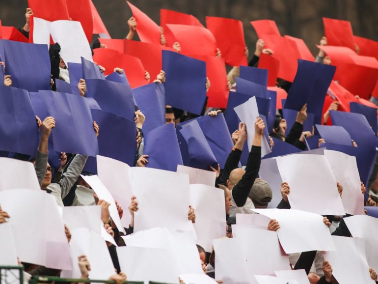 Они који су држали црвени картон - окретали би његову другу, белу страну, а они у доњим редовима су учинили обрнуто, па је трибина уместо српском заставом одједном бивала "обојена" - руском (бело-плаво-црвеном).