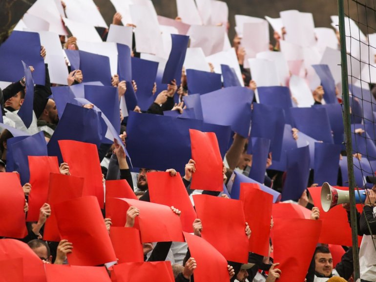 Стационирани на јужној трибини, навијачи Звезде су, певајући стих "Бој се бије, бије", за почетак приредили црвено-плаво-белу кореографију. Српску тробојку су "исцртали" картонима које су присталице београдског клуба држале у рукама.