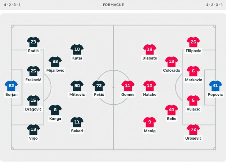 Мирко Иванић се ипак није опоравио за дерби и зато ће у стартној постави Црвене звезде бити Стефан Митровић, док је и Игор Дуљај направио промену која се није очекивала. Уместо Љубомира Фејсе, од почетка ћемо гледати колумбијског фудбалера Колорада.