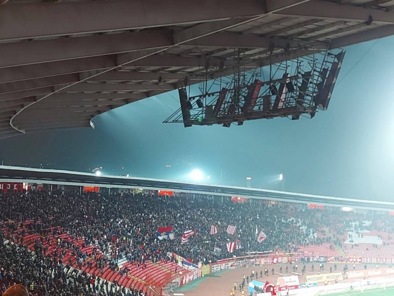 52. минут - Главни арбитар Живковић је прекинуо утакмицу, видљивост је потпуно смањена, огроман облак дима након застрашујуће бакљаде гробара лебди над Мараканом.
