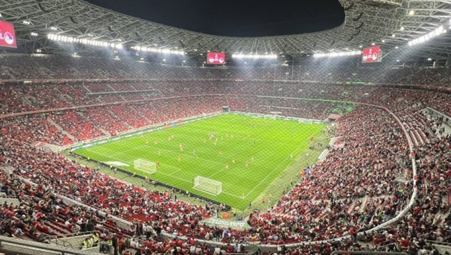20.28 - "Пушаш арена" је крцата одавно. Има ту и Срба, али... већ више од сат времена - пуне трибине, са преко 95% мађарских навијача, жељно ишчекују почетак.