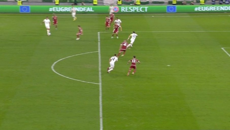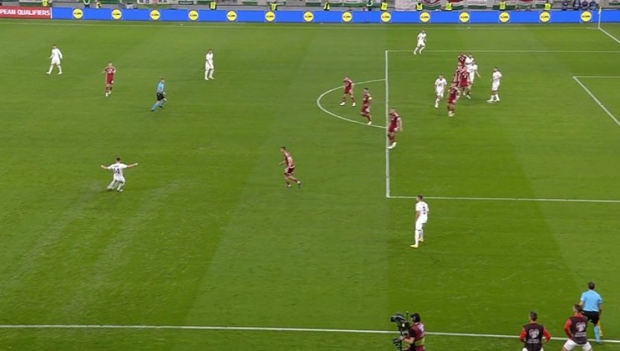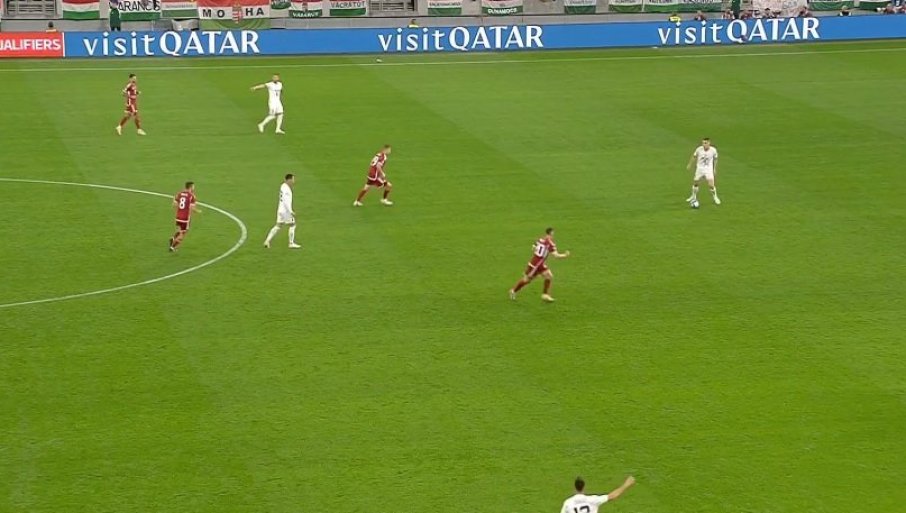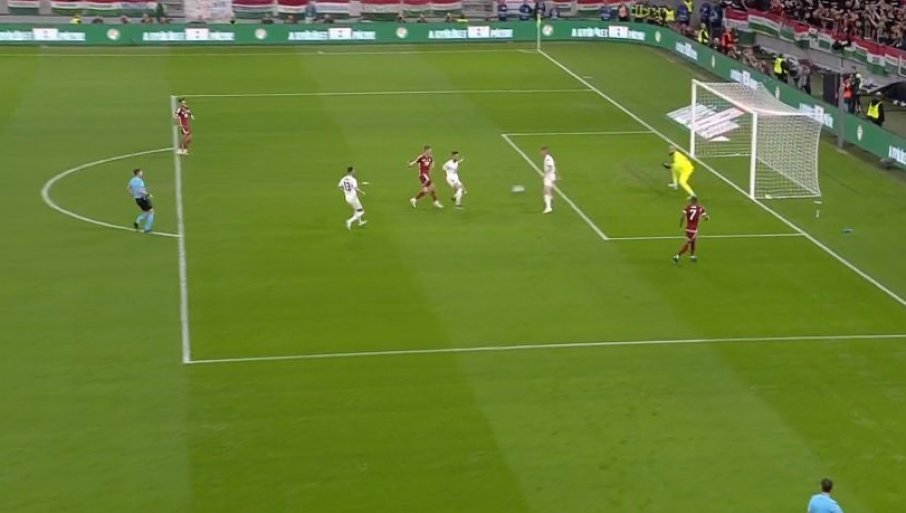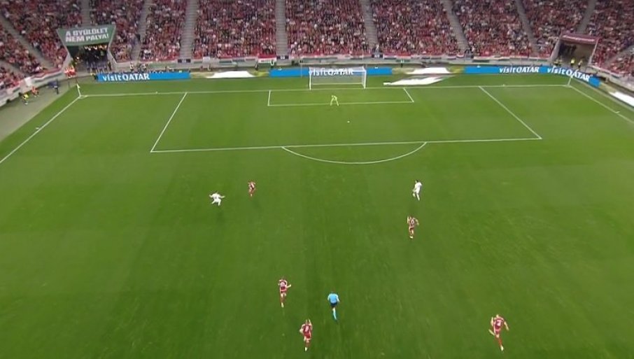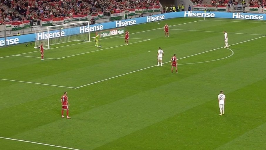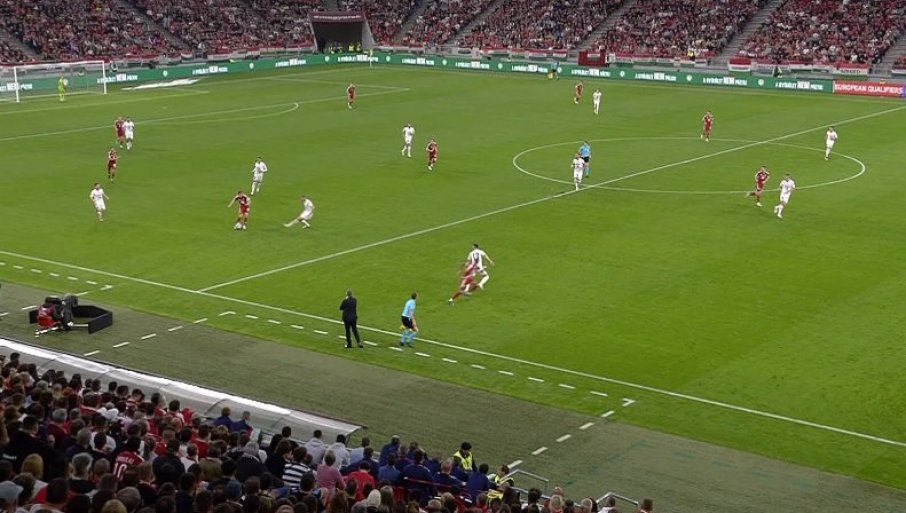 11' - Мађарска не срља, не врши пресинг на дефанзивце Србије док не приђу с лоптом ближе центру игралишта. То отежава примопредају лопте српским "везњацима" па се понекад, као сада, деси и испуцавање од стране голмана Вање Милинковића Савића. Није то донело жељени резултат, Мађари су изборили аут на својој половини.