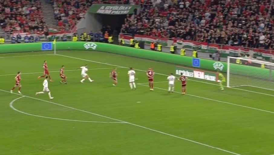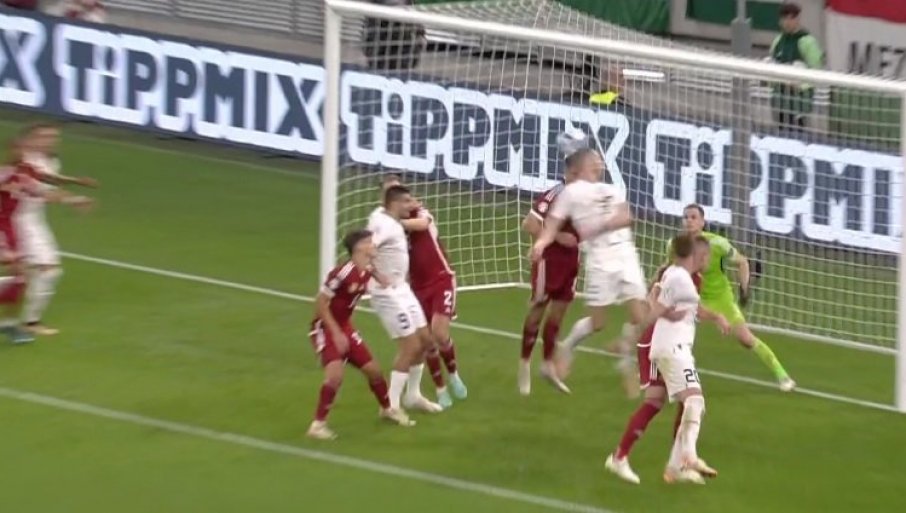 45' - Митровић је центирао са десне стране, Живковић пробао главом - но лак је то плен за чувара мреже Мађарске. Али, његова екипа одмах потом губи лопту услед доброг пресинга "орлова", Гаћиновић је припретио и... изборен је корнер.