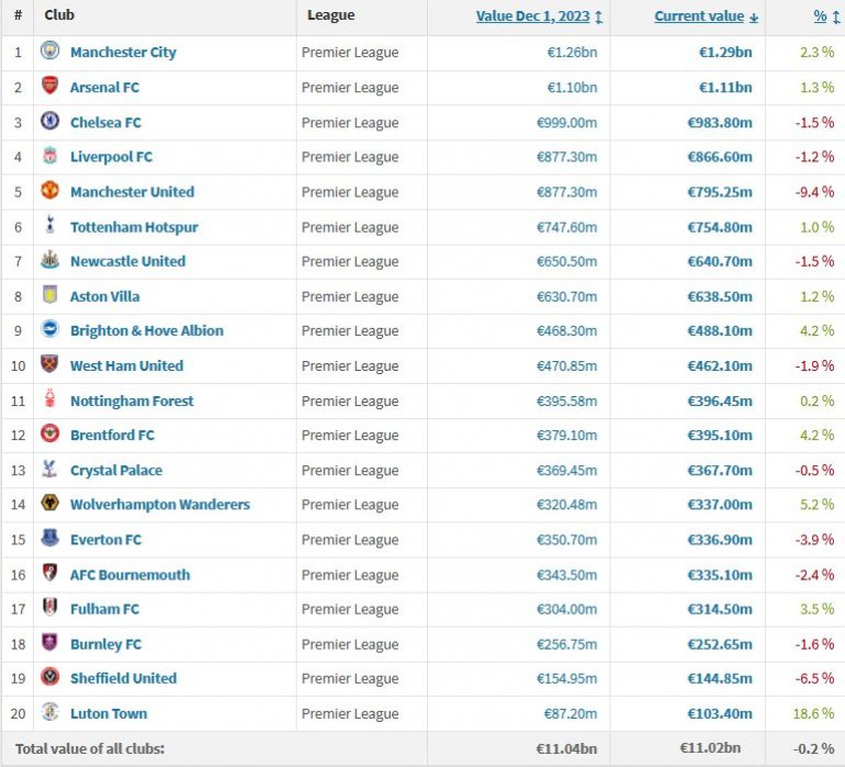 Арсенал је процењен на 1,1 милијарду, док су Челси (983.80 милиона), Ливерпул (866,60) и Манчестер јунајтед (754,80) међу највреднијим клубовима Енглеске, али и Европе.