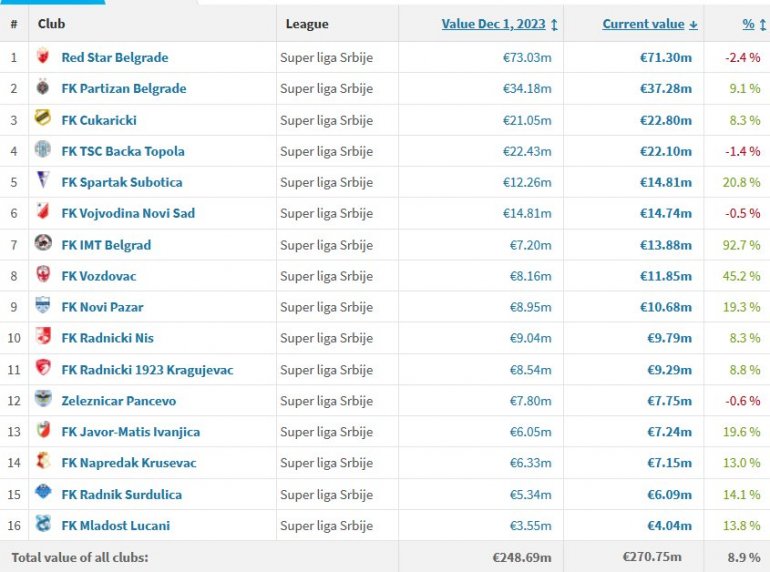 Занимљив је и податак да су само три клуба јефтинија од целокупне Моцартбет Суперлиге Србије.