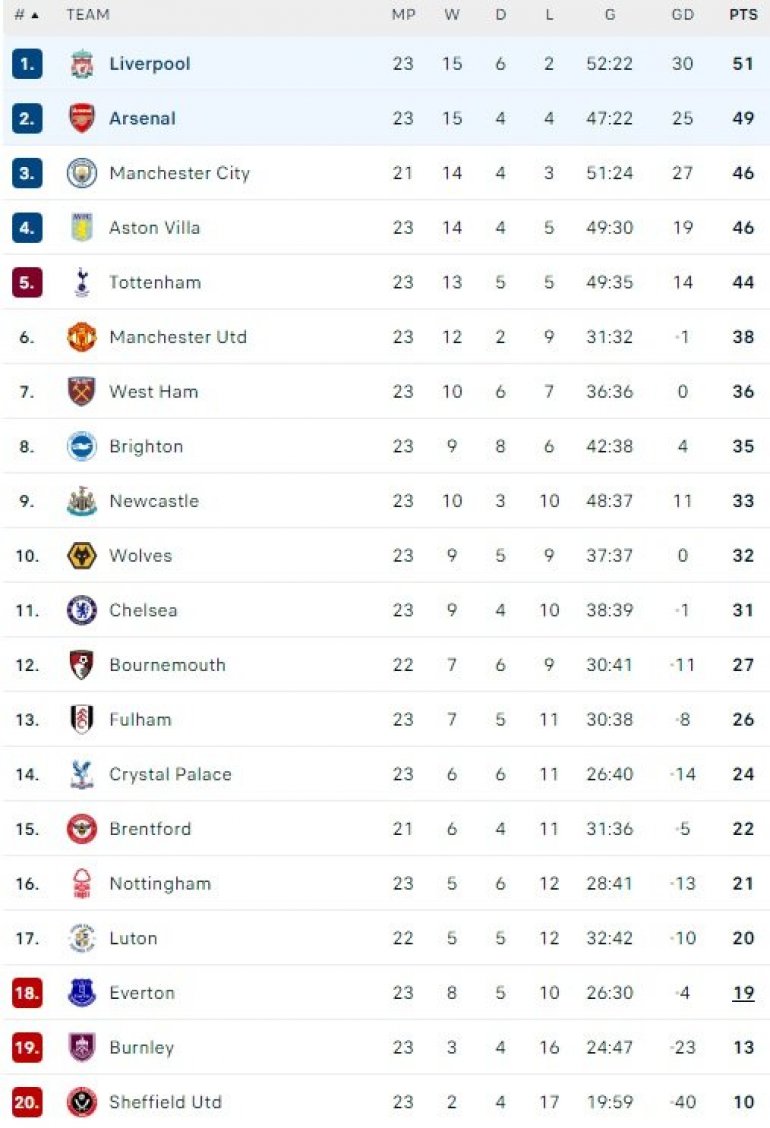 Тада је и постављен коначан резултат, после ког је Ливерпул остао први на табели, јер има и даље 51 бод, али сада му је први пратилац Арсенал са 49. Манчестер сити има 46, али са две утакмице мање може, ако их реши у своју корист, да избије на чело изузетно узбудљиве Премијер лиге.
