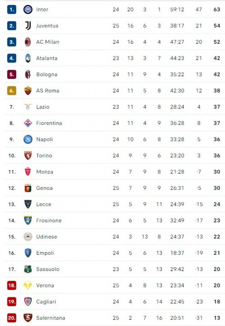 Крај шампионата је, наравно, још увек далеко - треба свако да одигра по 38 утакмица, али са оволиким заостатком, требало би неко чудо да се деси да "Јуве" стигне лидера.