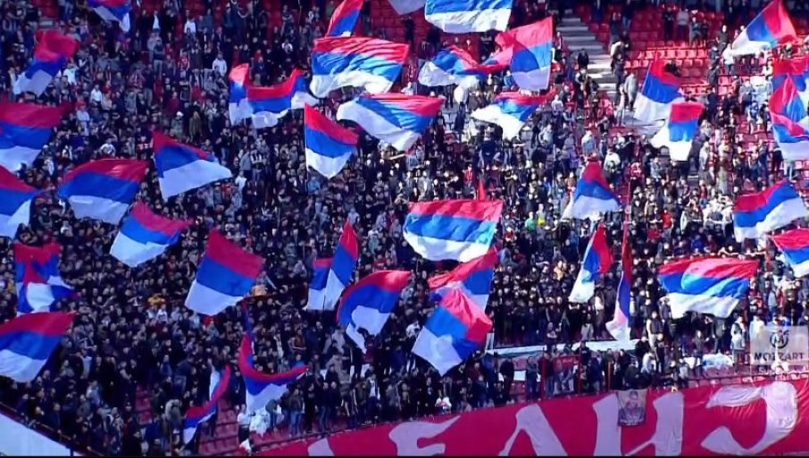 15.55 - На стадиону је око 10.000 гледалаца, а на северној трибини попуњени су средишњи сектори и бројни навијачи имају српске тробојке.