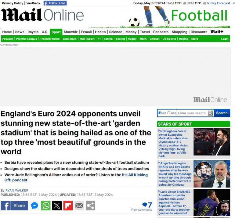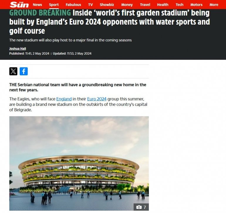 "Орлови“, који ће се овог лета суочити са Енглеском у групи Еура 2024 , граде потпуно нови стадион на периферији главног града Београда. Стадион би требало да буде завршен до 1. децембра 2026. године и описан је као „баштенски стадион“ захваљујући фасади прекривеној зеленилом. Стадион неће имати само задивљујући екстеријер, већ ће моћи да прими 52.000 навијача, наводи се у тексту "Тхе Сун".