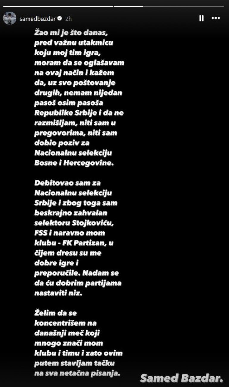 - Жао ми је што пред важну утакмицу коју мој тим игра, морам да се оглашавам и на овај начин кажем да, уз сво поштовање других, немам ниједан други пасош осим пасоша Републике Србије. Не размишљам, нити преговарам, нити сам добио позив за селекцију Босне и Херцеговине. Дебитовао сам за репрезентацију Србије и због тога сам бескрајно захвалан селектору Стојковићу, ФСС-у и, наравно, мом клубу, Партизану, у чијем дресу су ме игре и препоручиле. Надам се да ћу добрим партијама наставити низ. Желим да се концентришем на меч који много значи мом клубу и овим путем стављам тачку на сва нетачна писања - написао је Баждар на Инстаграму.