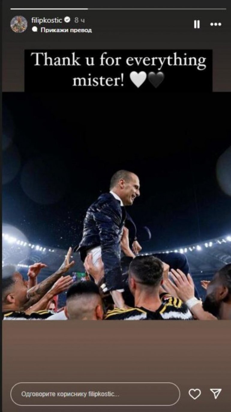 Такође се захвалио остатку стручног штаба који напушта екипу, а од Алегрија се опростио и други Србин у редовима Јувентуса. Филип Костић је уз слику на којој играчи бацају Макса Алегрија у ваздух написао: "Хвала ти на свему мистер."