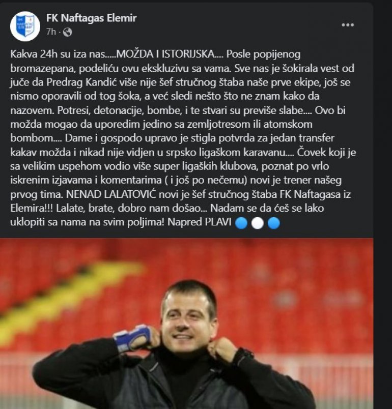 Званична фејсбук страница Натгагаса из Елемира огласила се данас са информацијом да је Ненад Лалатовић нови тренер српсколигаша који се такмичи у Српској лиги Војводине.