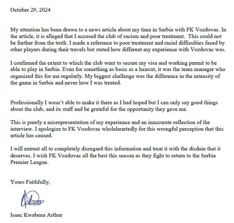 Исак Квабена Артур, бивши фудбалер Вождовца, демантовао је тврдње да је током давања интервјуа за један страни медиј рекао како је расно био дискриминисан док је играо за београдски клуб.