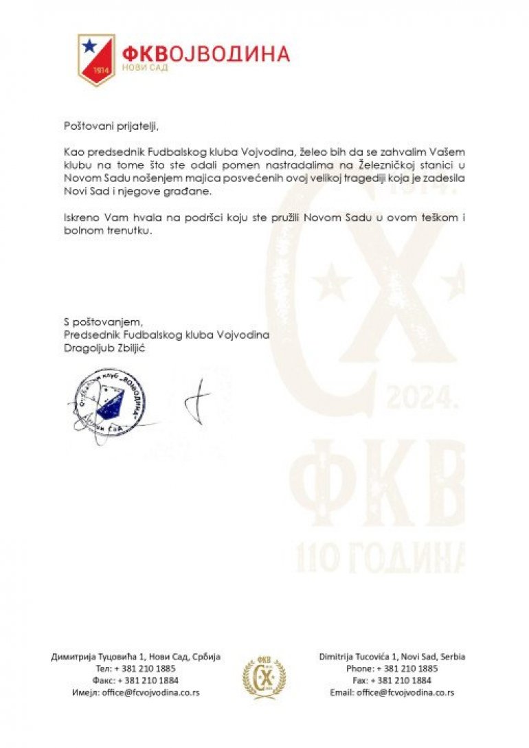 Као председник ФК Војводина желео бих да се захвалим вашем клубу на томе што сте одали помен настрадила на Железничкој станици у Новом Саду ношењем мајица посвећених овој великој трагедији која је задесила Нови Сад и његове грађане.