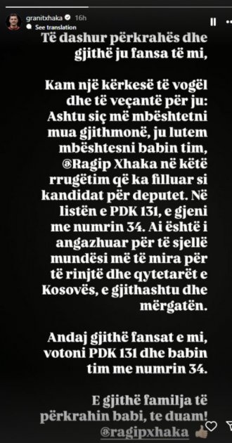 "Имам један мали и посебан захтев за вас. Као што увек подржавате мене, молим вас да подржите мог оца, Рагипа Џаку, на овом путу који је започео као кандидат за посланика. Он је посвећен пружању бољих могућности за младе и грађане, као и за дијаспору", написао је Џака на Инстаграму и додатно раснео Србе.