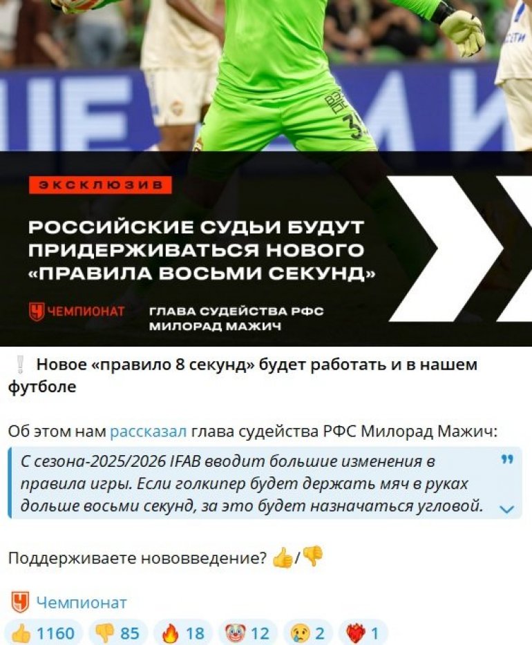 - Од сезоне 2025/2026, ИФАБ ће увести велике промене у правила игре. Ако голман држи лопту у рукама дуже од осам секунди, досуђује се ударац из угла. Последњих пет секунди судија ће бројати руком тако да то буде видљиво свим играчима, гледаоцима, коментаторима и тренерима екипа. По мом мишљењу, предност ове иновације је што су правила о губљењу времена досад била веома нејасна. Голман је досад био кажњаван индиректним ударцем због предугог задржавања лопте, а сада ће бити уведено строжије правило: после осам секунди судија ће досудити корнер у корист противничке екипе. Наравно, када добијемо званично писмо од ИФАБ и ФИФА, обавестићемо Руску премијер лигу, Другу лигу и целу руску фудбалску заједницу о томе и почети да припремамо наше судије - рекао је Мажић у разговору са дописником Шампионата Иљом Никуљниковом.