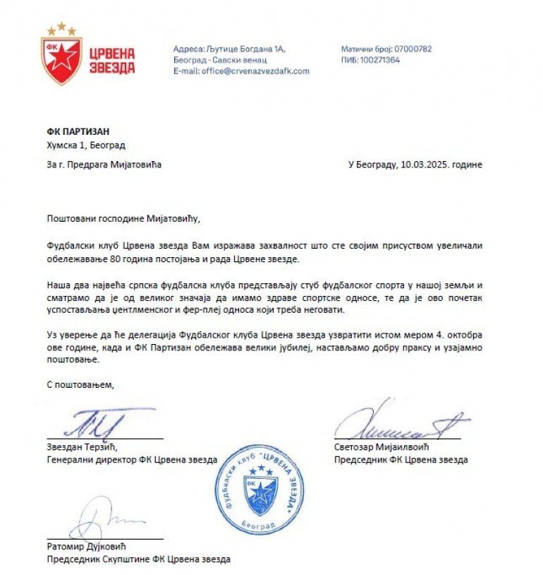 Уз уверење да ће делегација Фудбалског клуба Црвена звезда узвратити истом мером 4. октобра ове године, када и ФК Партизан обележава велики јубилеј, настављамо добру праксу и узајамно поштовање"