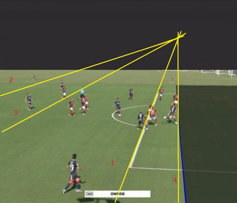 Да бисте било када, у било којој ситуацији, могли да видите да ли је добро или није добро нацртана паралелна линија у односу на, рецимо, линију која раздваја две половине терена (или гол-аут линију, или линију казненог простора), потребно је да из своје перспективе "продужите" неке од правих, већ нацртаних линија терена (рецимо, ону којом се завршава шеснаестерац - у нашем примеру, то је прво повучено и означено бројем 1). Потом треба продужити још неку а од видљивих паралелних линија (у овом случају 2. и 3.) и тако се, тамо негде у даљини, добија "тачка недогледа". Из ње онда повлачењем праве линије било где по терену (а офсајд се "испитује", то је онда линија број 4) - добија свакако паралелна линија оним основним линијама, јер стиже из "тачке недогледа".