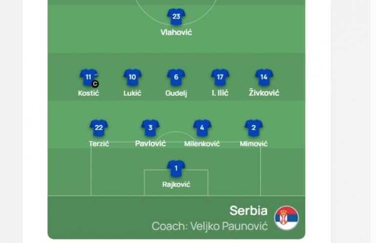 19.40 - Формацијски, док меч не почне, делује да је Србија у систему 4-5-1. Нови селектор Пауновић је и најавио да ће користити свој омиљени, "четвороделни" принцип задње линије, а чине га, испред голмана Рајковића, десно Мимовић, лево Терзић, а у средини наши најбољи штопери, Павловић и Миленковић. Петорка испрд њих су, с лева на десно, Костић, Лукић, Гудељ, И. Илић и Живковић (један од кључних играча Пауновићевих "орлића" који су 2015. постали прваци света) док је истурен Влаховић.