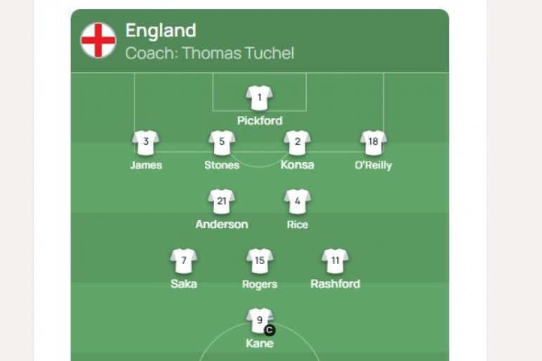 Енглеска: Пикфорд, Конса, Џејмс, Рајс, Стонс, Роџерс, О'Рајли, Андерсон, Сака, Рашфорд, Кејн