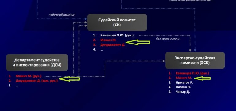 Они су чланови Судијског комитета Фудбалског савеза Русије (РФС), који немају право гласа када се одлучује о дешавањима у самом РФС, али који су истовремено на челу Одељења за судије и инспекцију (ДС), и то Мажић као руководилац, а Ђурђевић као његов заменик.