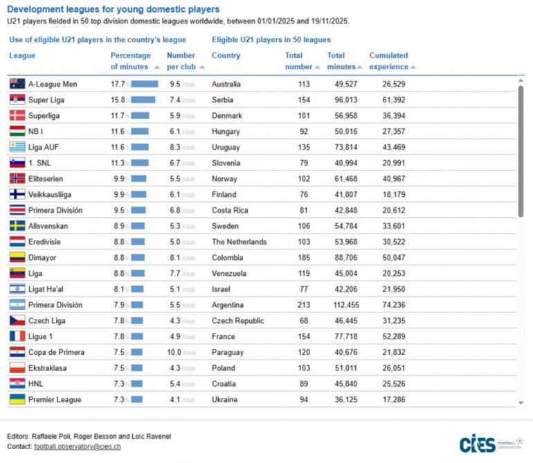 Српска елитна лига друга је у свету по броју одиграних минута фудбалера до 21 године који су истовремено домаћи, односно репрезентативно подобни играчи.