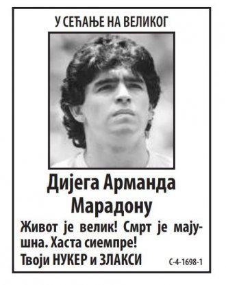 "ЖИВОТ ЈЕ ВЕЛИКИ, СМРТ ЈЕ МАЈУШНА"! У "Новостима" објављена читуља Дијегу Арманду Марадони и то од кога