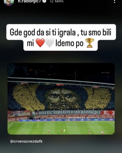 А након меча се огласио Немања Радоњић, суспендовани фудбалер Црвене звезде. Наиме, неколико минута после поноћи, Радоњић је на Инстаграму објавио слику северне трибине са меча против Лила и осим поруке захвалности "делијама" написао: