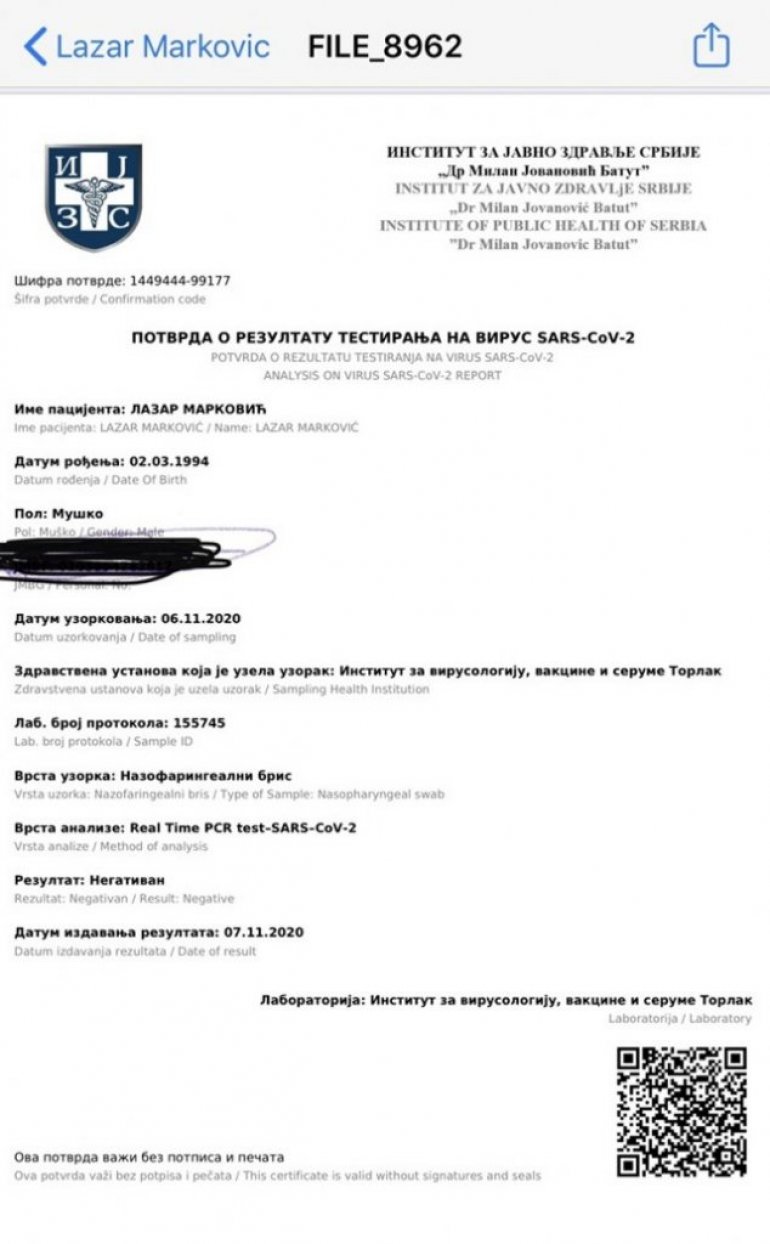 - Са великом радошћу обавештавамо јавност да је на поновљеном тесту за САРС-Цов-2 закључно са 7. 11. 2020. Института за јавно здравље Србије 'Др Милан Јовановић Батут', играч Партизана Лазар Марковић негативан, те ће бити на услузи Александру Станојевићу за меч 14. кола Супер лиге Србије", навео је клуб из Хумске, само дан пошто је саопштио да је Марковић имао позитиван налаз на тестирању.
