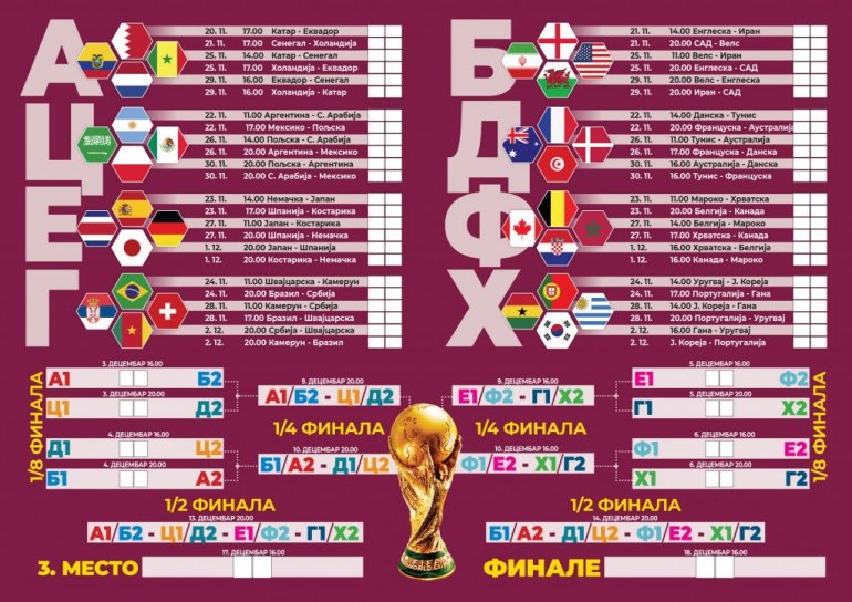 Временска зона? Катар је два сата "испред" Србије, а "Новости" вам доносе распоред мечева по нашем, средњоевропском времену (како по групама, тако и, у доњем делу текста, по данима). Када такмичење почне, сваку групу ће на овој страници пратити и њене табеле, које ће се аутоматски освежавати у зависности од резултата мечева.